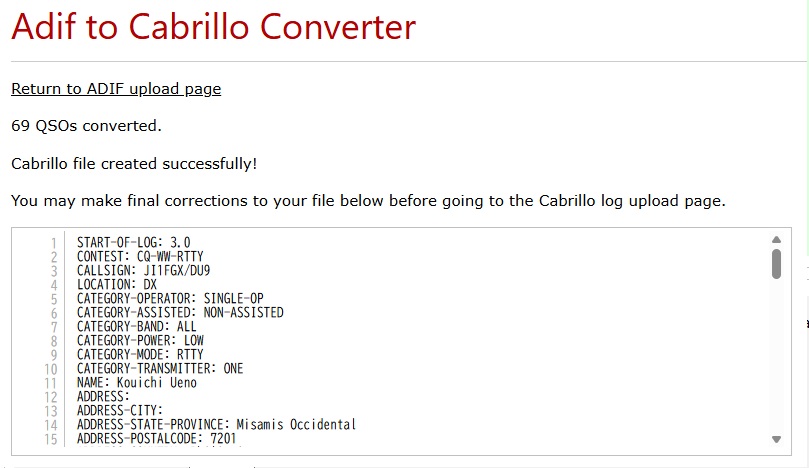 次にAdif to Cabrillo Converterというものが開きますのでデーターの確認と必要ならAddress等を書き加えます