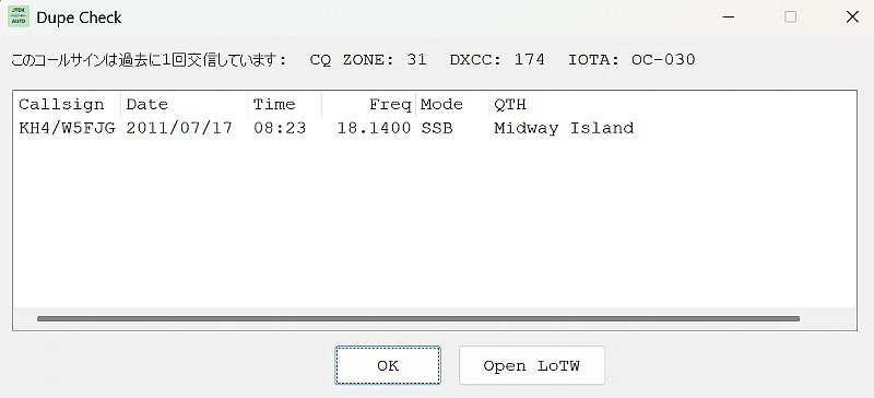 Log QSOウインドウが開くと自動で「OK」が押されて