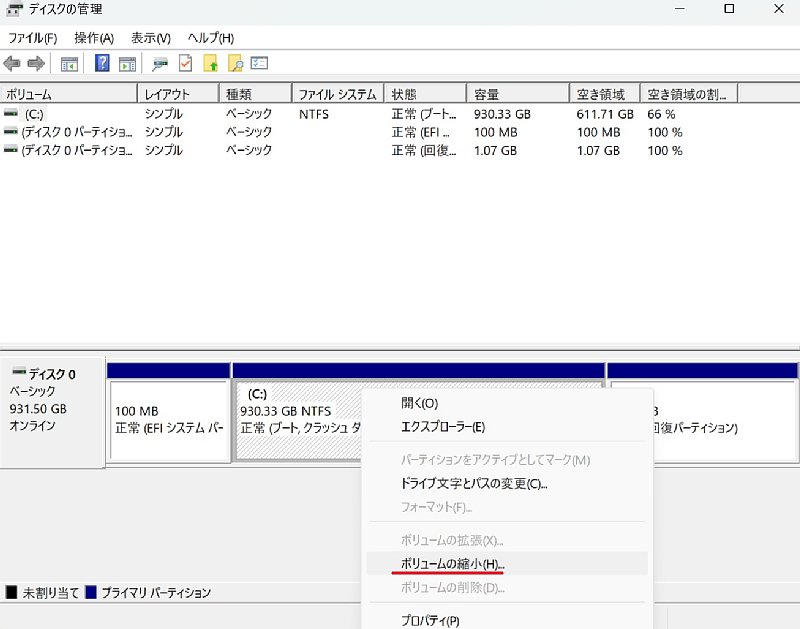 「スタート」―「ディスクの管理」を選び、CドライブからLinux Mint用に60GB程を割り当てます