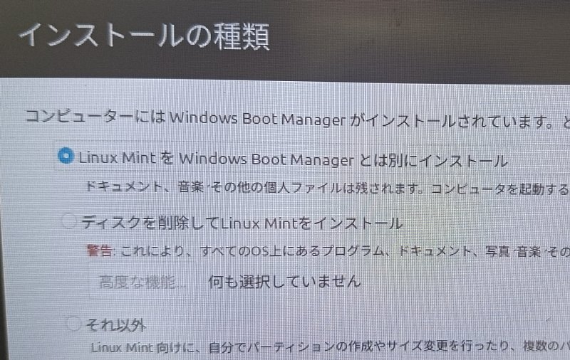 インストール済みのWindowsを消さないのであれば「Linux MintをWindows Boot Managerとは別にインストール」を選ぶ事