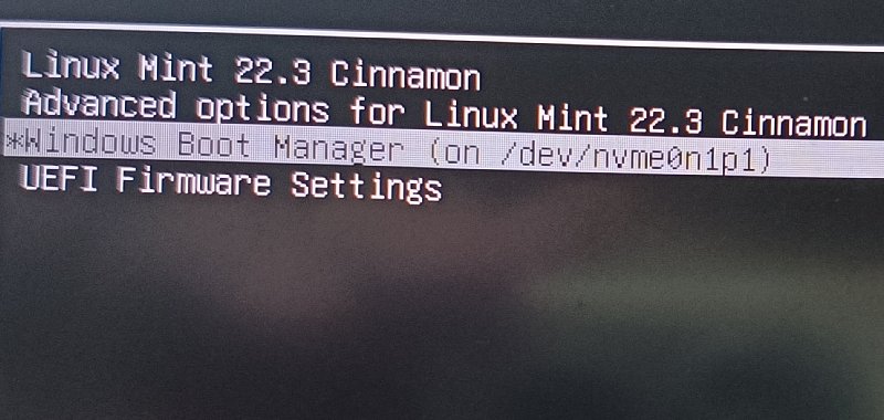 Linux Mint 22.3 CinnamonとWindows Boot Managerが選べるようになっています