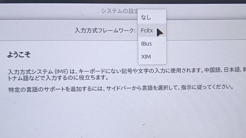 最後に入力方式フレームワークの「Fcitx」を選んで一旦ログオフすれば日本語入力も出来るようになります
