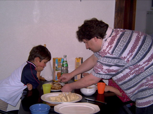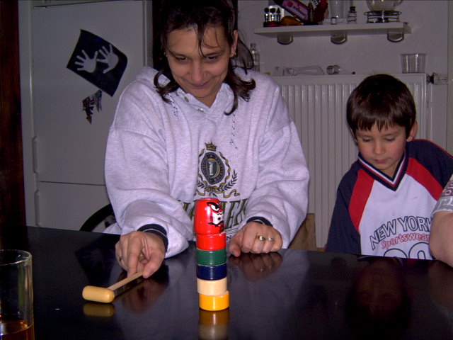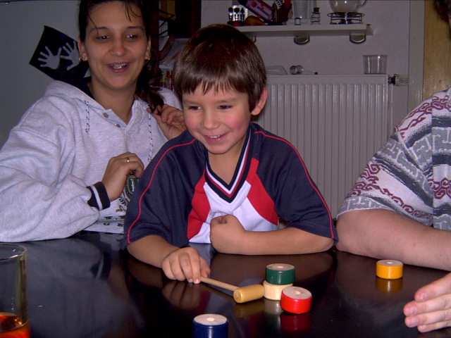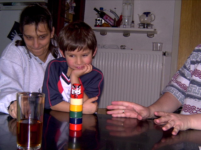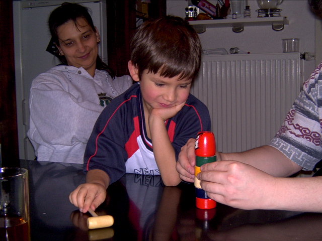 食後に私が日本から買っていっただるま落としで遊ぶOliver君