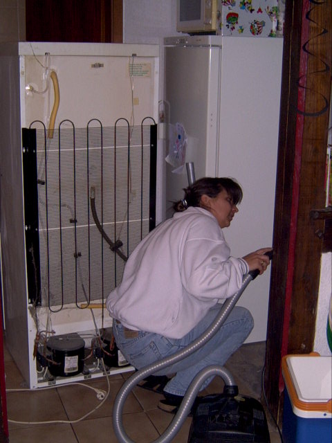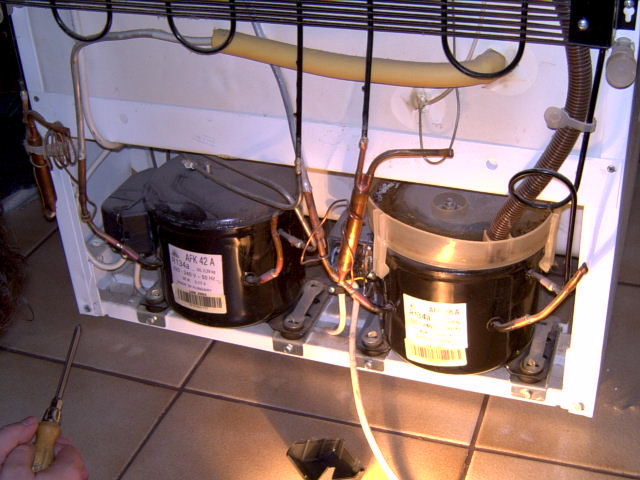 冷蔵庫を裏返しさっそくコンプレッサーを点検するも異常なし