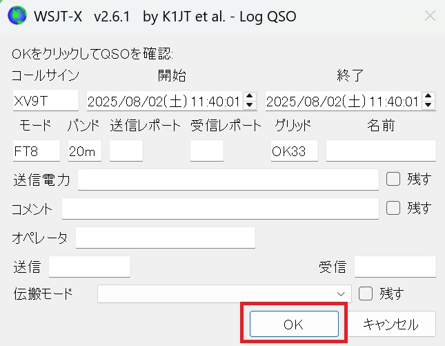 Log QSOウインドウが開くと自動で「OK」が押されて交信を終了させます