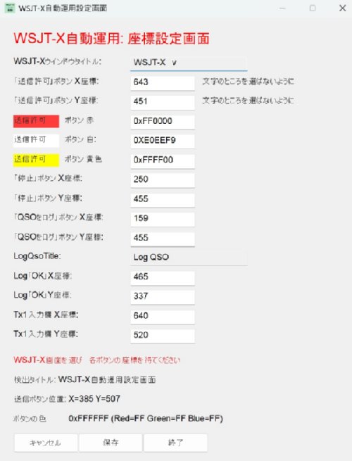 座標を取り終えたら「保存」を押してから「終了」を押してWSJT-XとWSJT-X自動運用を再起動してください