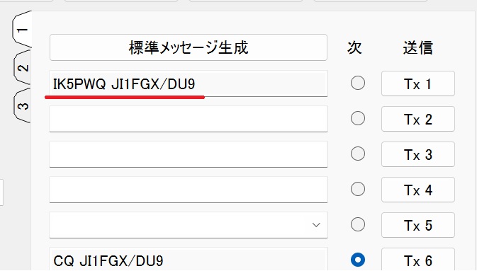 Tx1の欄に通常交信または手入力でコールサインを入力してエンターを押します