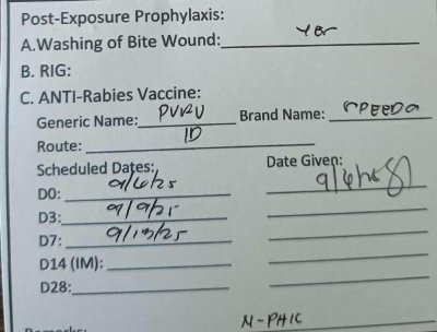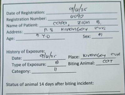 15時頃、孫のZionの母親Jennyから「子猫に指を噛まれて出血したから狂犬病の暴露後ワクチン注射を受けたい」