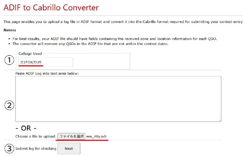 ADIF to Cabrillo Converterというのが有るので作ったADIファイルをアップロード