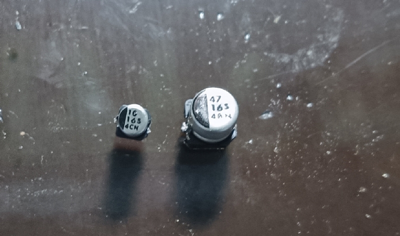 Ozamizの電子部品パーツショップでは表面実装型電解コンデンサーは売っていなかったので普通の100μF16V電解コンデンサーを購入
