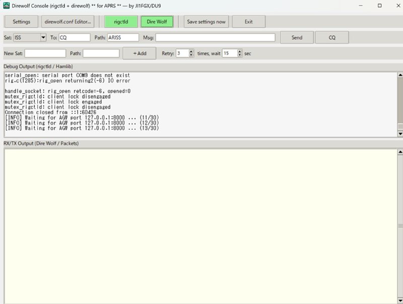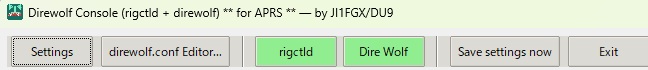 設定が終わったらrigctrldボタンとDire Wolfボタンを一旦OFFにしてON(グリーン)にして設定ファイルを読み込みなおしてください
