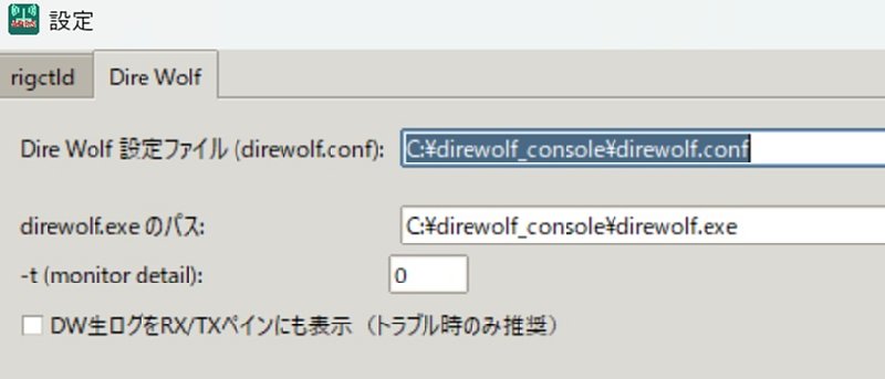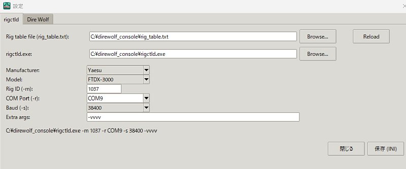 rigctrldボタン、Dire Wolfボタンの順番に押す必要が有ります