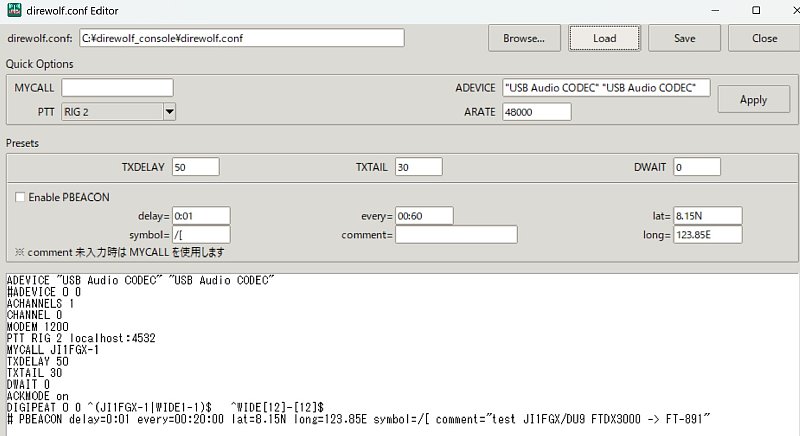 続いてdirewolf_conf EditorでAPRS TNCの設定を行います