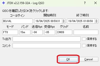 Log QSOウインドウが開くと自動で「OK」が押されて