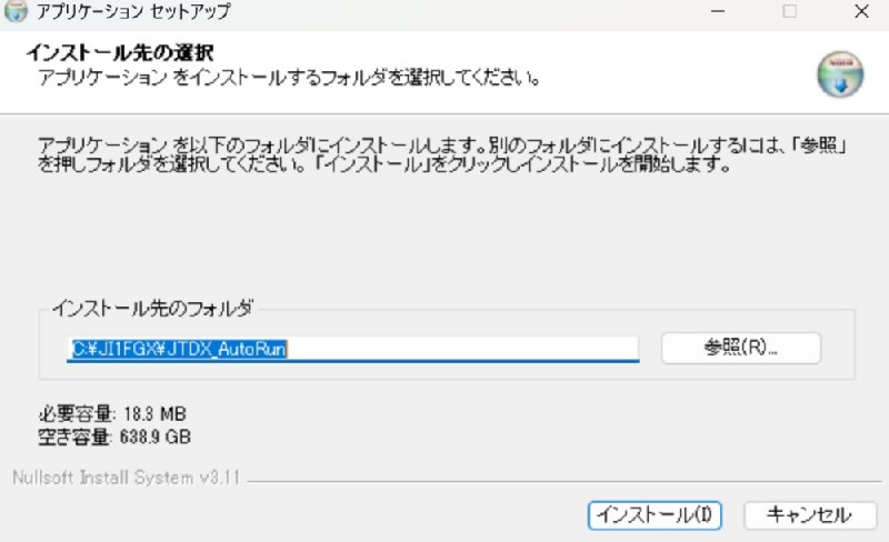 インストールディレクトリはC:\ji1fgx\JTDX_AutoRun¥です