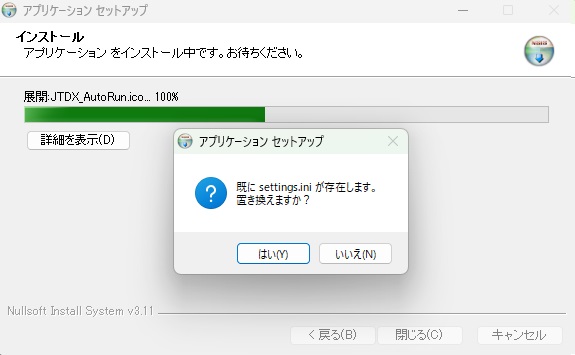 2度目以降のインストールではC:\JI1FGX\JTDX_AutoRun\settings.iniを置き換えるか表示します