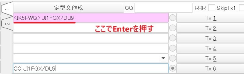 Tx1の欄に通常交信または手入力でコールサインを入力してエンターを押します