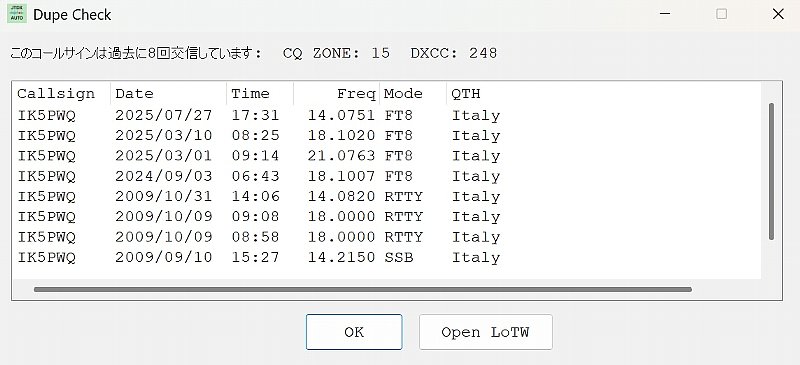 過去に交信していればそのリストとCQ ZONEとDXCCナンバーが表示されます