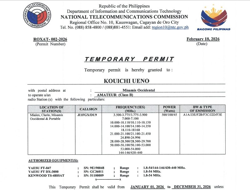 | JI1FGX/DU9 テンポラリーライセンスの更新 (2026/02/18) |